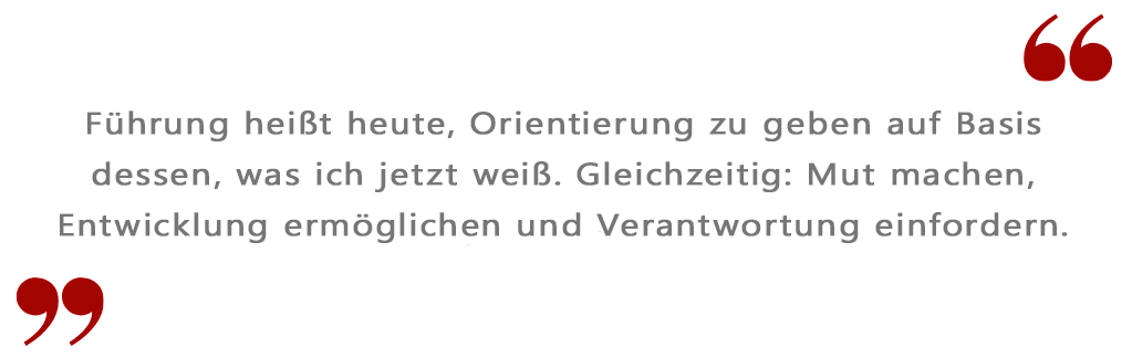 Führung heißt heute, Orientierung zu geben auf Basis dessen, was ich jetzt weiß. Und das auch transparent zu machen. Gleichzeitig geht es darum, Mut zu machen, Entwicklung zu ermöglichen und Verantwortung einzufordern.