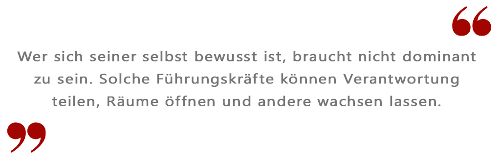 Wer sich seiner selbst bewusst ist, braucht nicht dominant zu sein. Solche Führungskräfte können Verantwortung teilen, Räume öffnen und andere wachsen lassen.